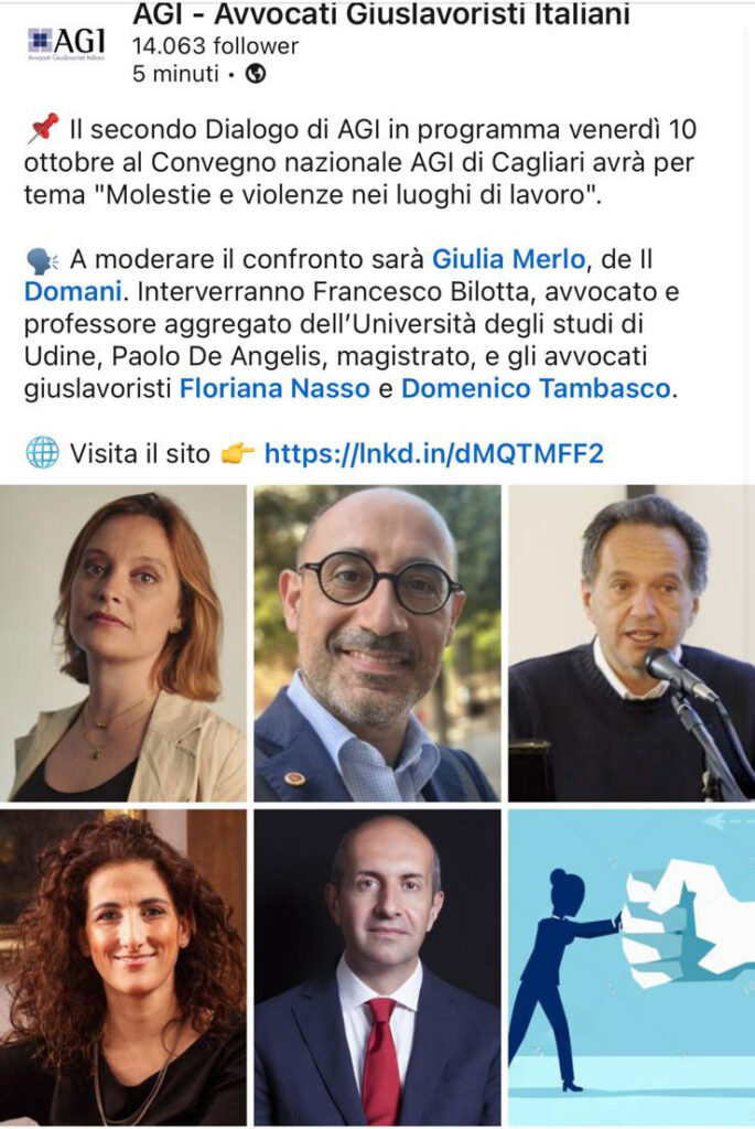 Il secondo Dialogo del Convegno Nazionale AGI – Avvocati Giuslavoristi Italiani, in programma a Cagliari venerdì 10 ottobre 2025, sarà dedicato a un tema di grande attualità: “Molestie e violenze nei luoghi di lavoro”.